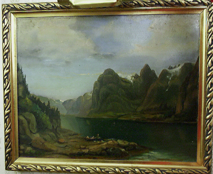 Men det som gjør oldefar så spennende for meg, er at han nok egentlig ville være kunstmaler, og at han også arbeidet iherdig for å oppnå denne status. Han gikk en tid i lære hos maleren Hans Gude som da hadde atelier i Sølvkrona i Horten. Oldefar malte en rekke bilder, men jeg har kun sett tre av dem. De er avbildet på denne siden. De bærer preg av at han malte som sine samtidige male-kolleger og at han kanskje var sterkt påvirket av sin læremester Hans Gude.